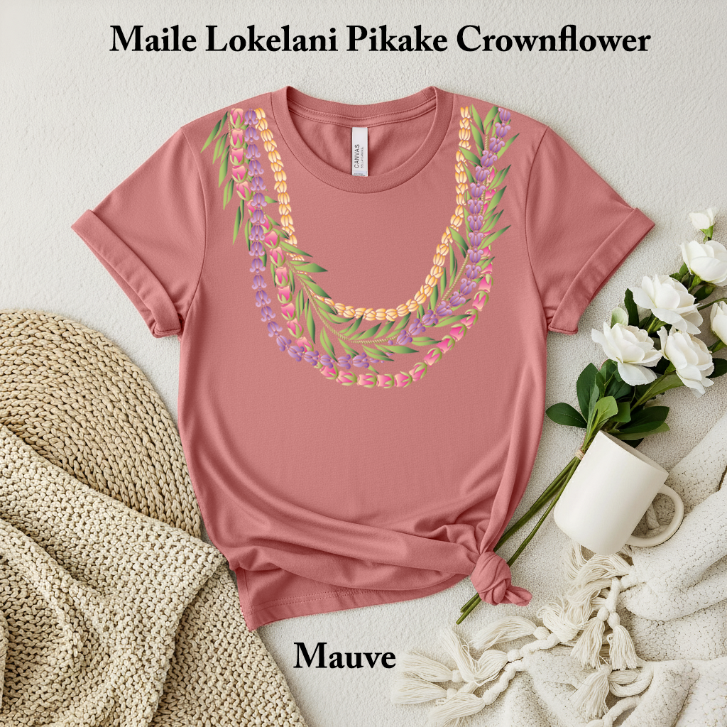 Celebrate the beauty of Hawaiʻi with this elegant Lei-inspired Hawaiian t-shirt, featuring a layered design of Maile leaves, Lokelani (rose), Pikake, and Crown Flower. This timeless piece blends cultural symbolism with modern everyday wear — perfect for those who carry aloha wherever they go.